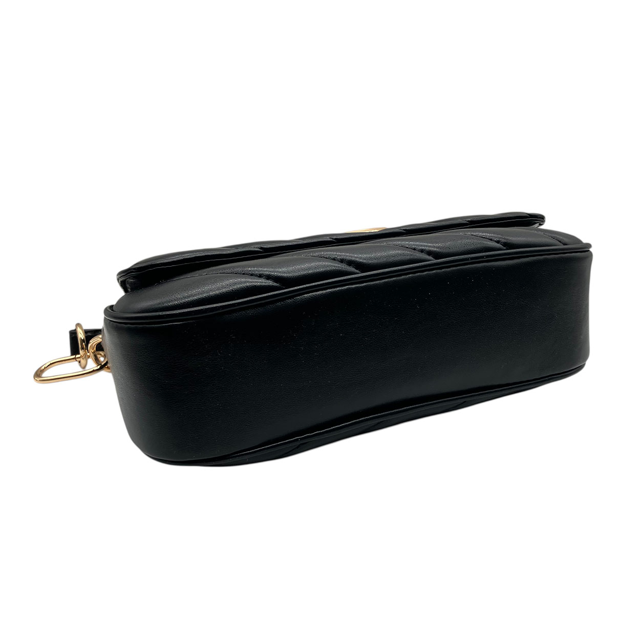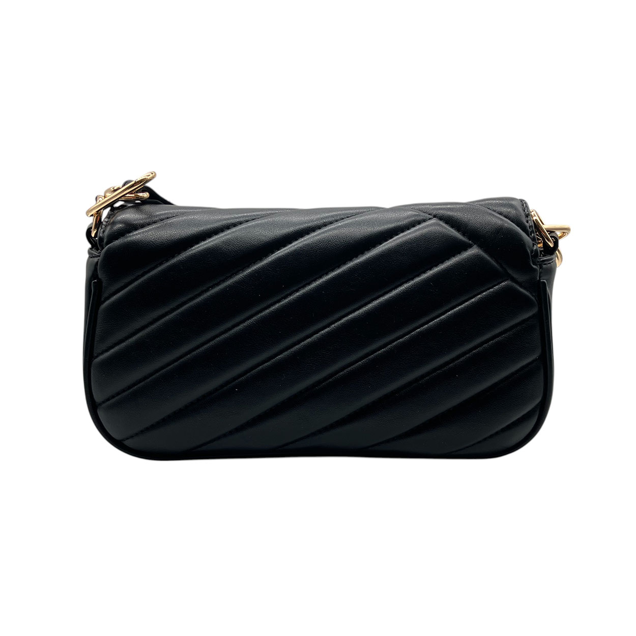 Borsetta portata a spalla e tracolla rimovibile in pelle ecologica goffrata a righe nero. Rifiniture in metallo dorato. Altezza 14 cm, larghezza 24 cm nella base, profondità 7 cm. Sacchetto protettivo incluso. Tracolla in pelle ecologica.