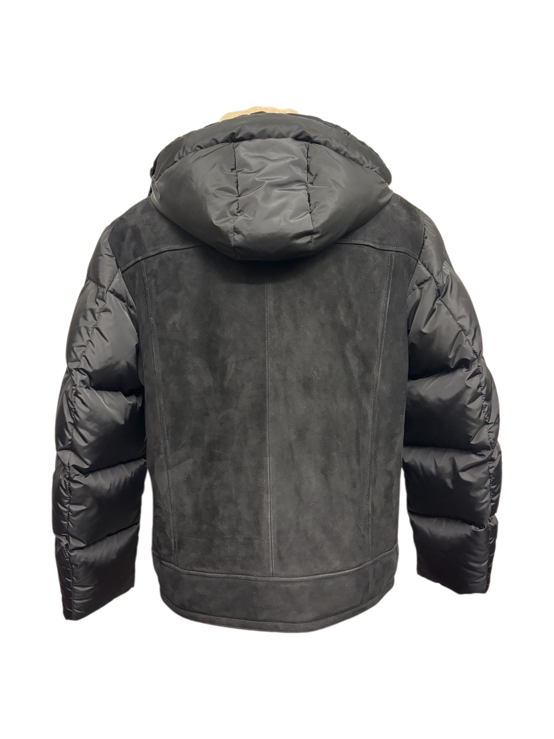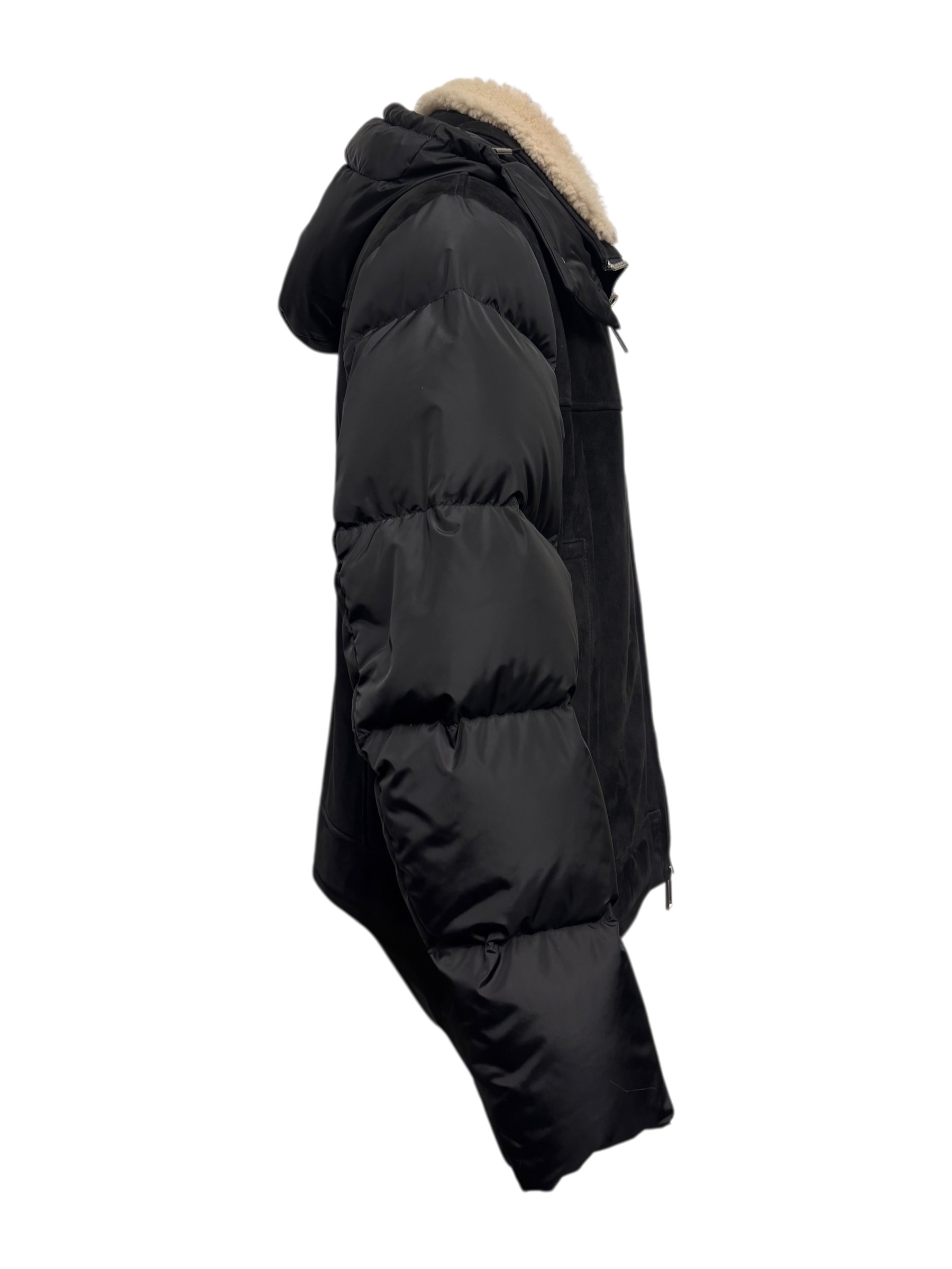 Giubbotto da uomo con cappuccio, in camoscio e tessuto tecnico imbottito in piuma, colletto in shearling.
