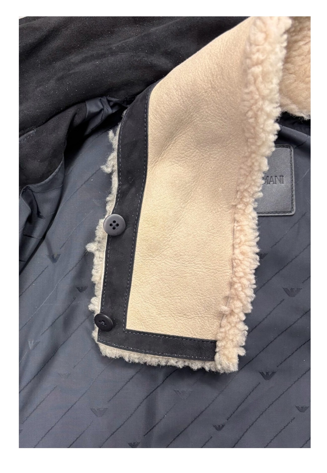 Combina materiali classici e lussuosi come il camoscio con un design moderno e sportivo, rendendolo un capo versatile e caldo per la stagione fredda. Fodera Interna in tessuto blu scuro con il logo Emporio Armani ripetuto in un motivo tono su tono. Chiusura a cerniera.
