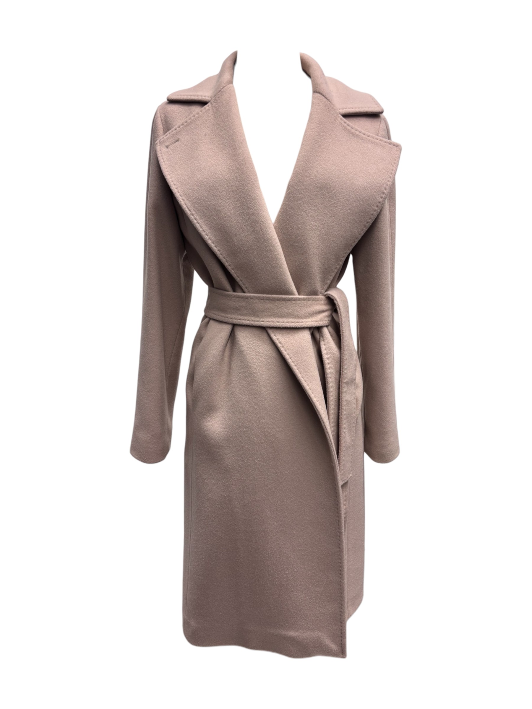 Cappotto a vestaglia con taglio dritto e chiusura a incrocio, dotato di una cintura coordinata rimovibile per segnare il punto vita.