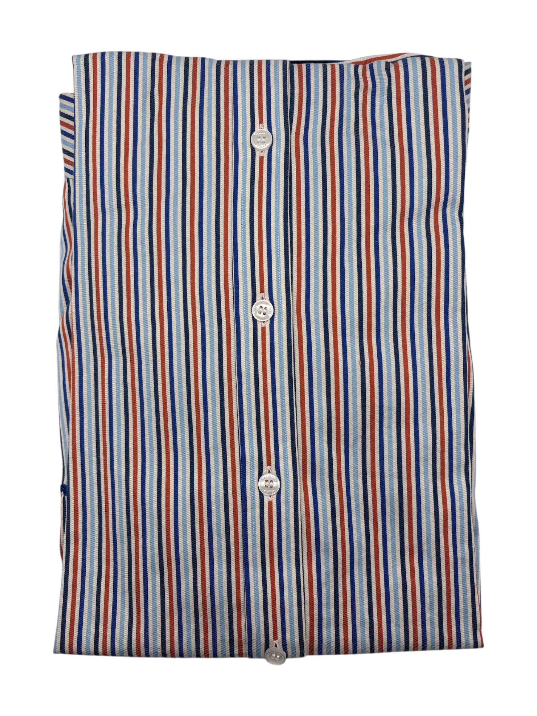 Camicia da uomo Harmont & Blaine raffinata e vivace, caratterizzata dall’iconico stile casual-chic del brand italiano. Motivo a righe verticali multicolore. La palette comprende tonalità di blu navy, azzurro carta da zucchero, arancione e bianco. L’iconico bassotto del brand è ricamato in blu. Colletto modello button-down. Regular fit.