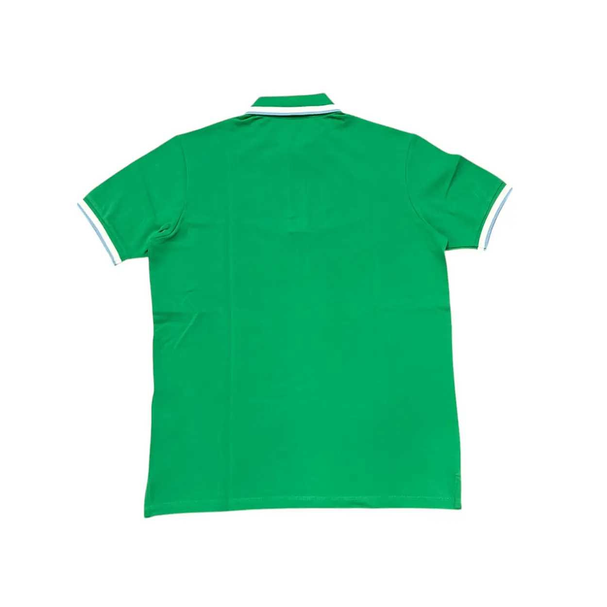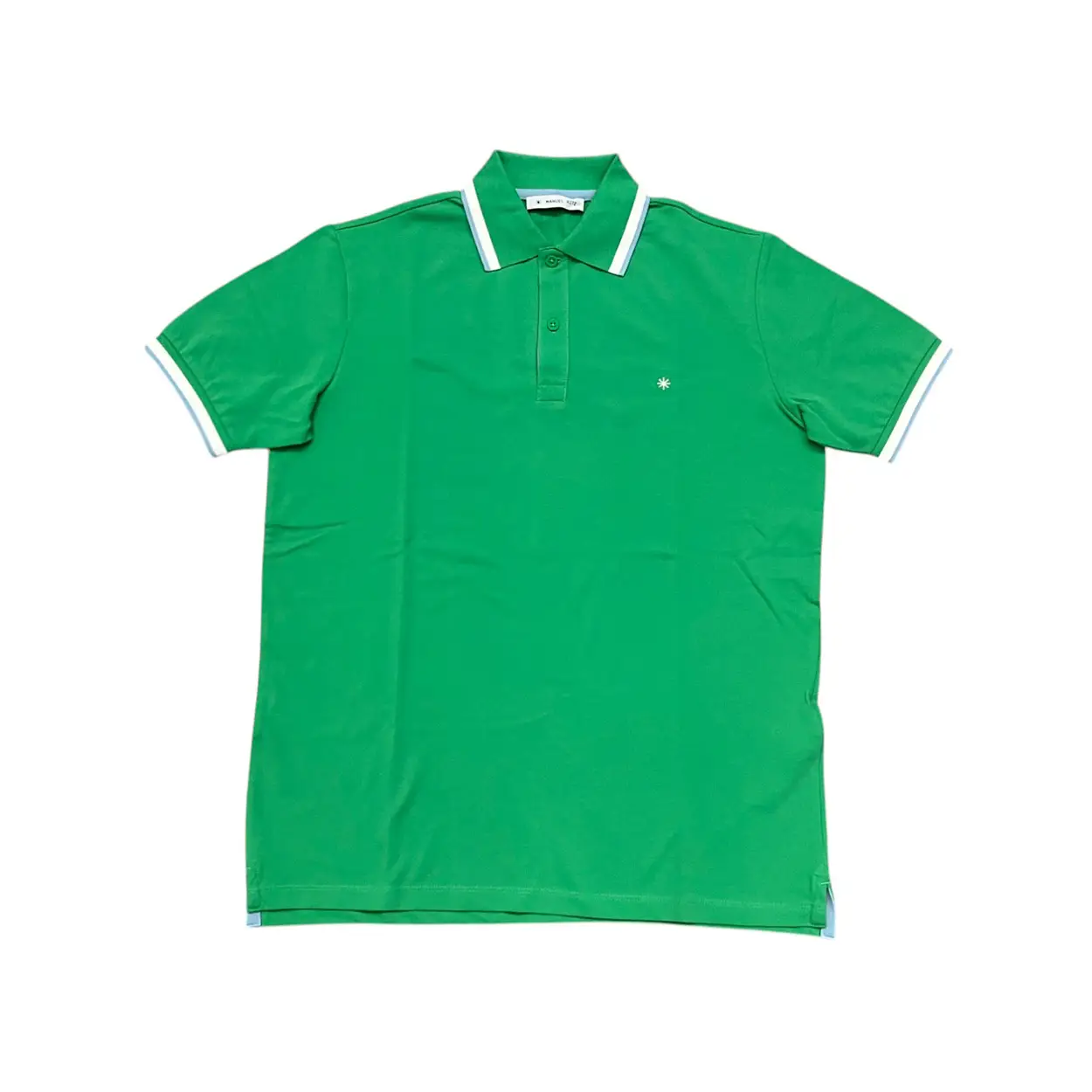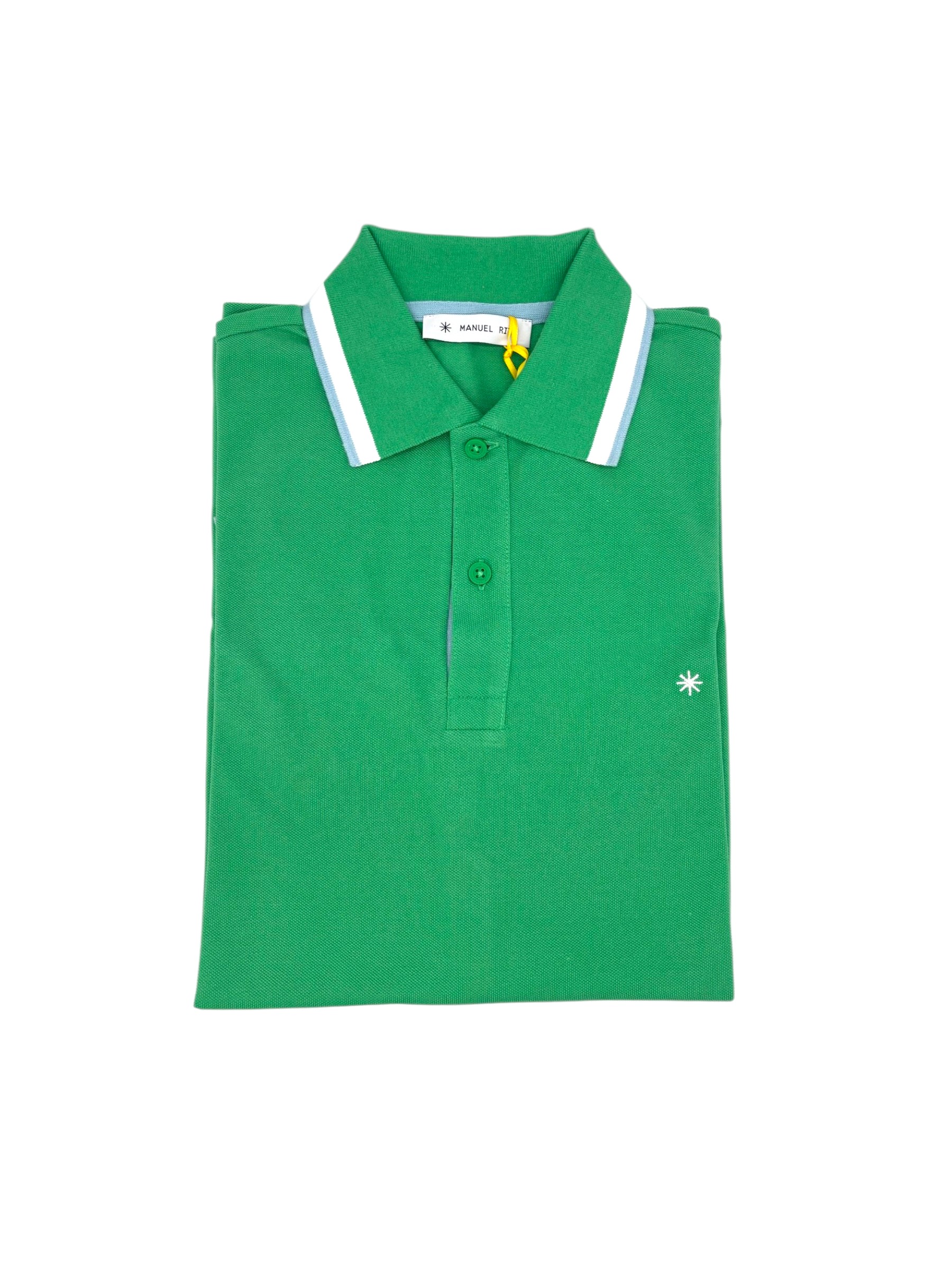 Polo Manuel Ritz in 100% cotone, colore verde con rifiniture bianche e celesti. Chiusura a due bottoni. Colletto classico. Piccoli spacchi laterali. Delicato logo ricamato sul petto in filo bianco.