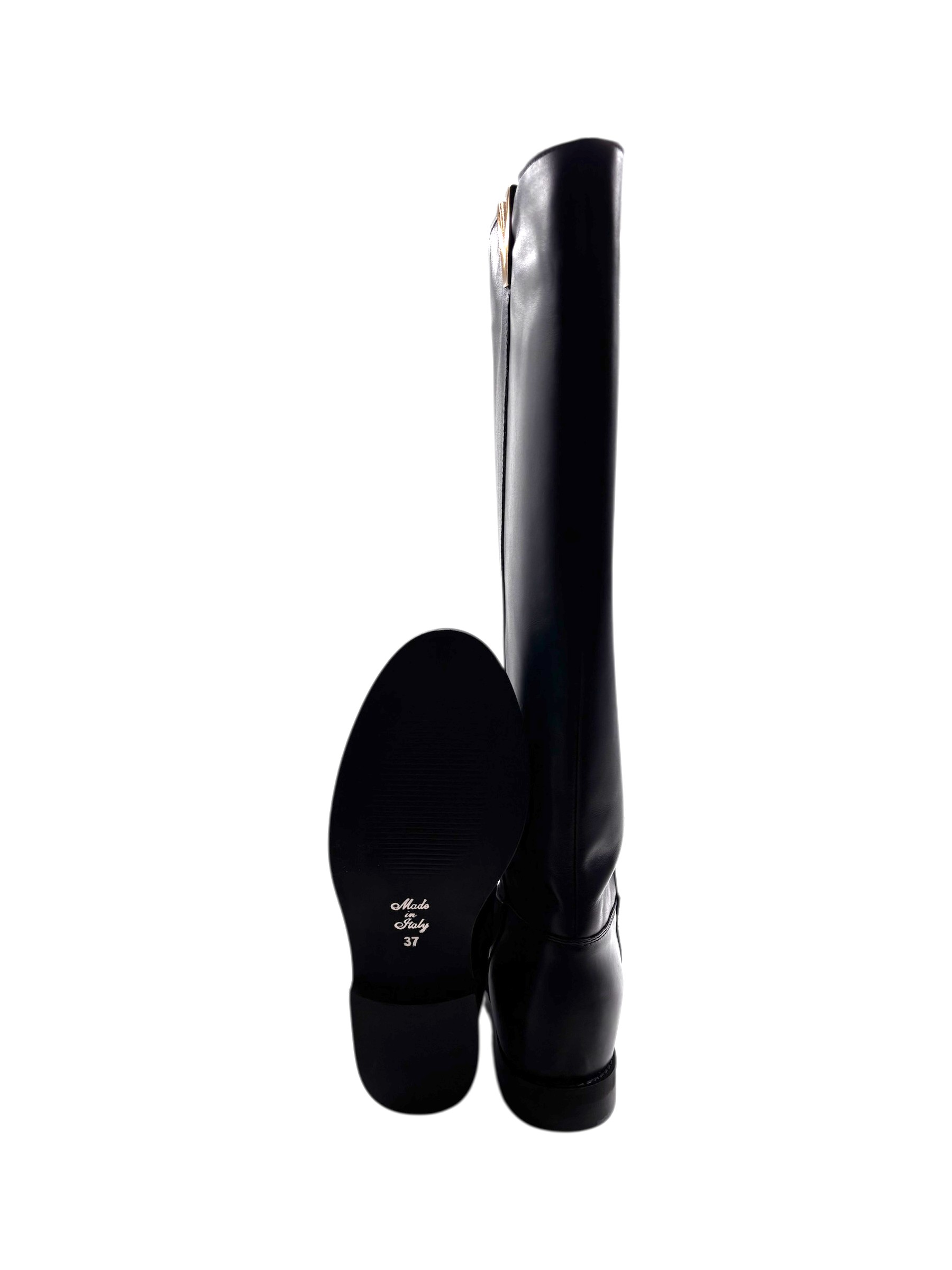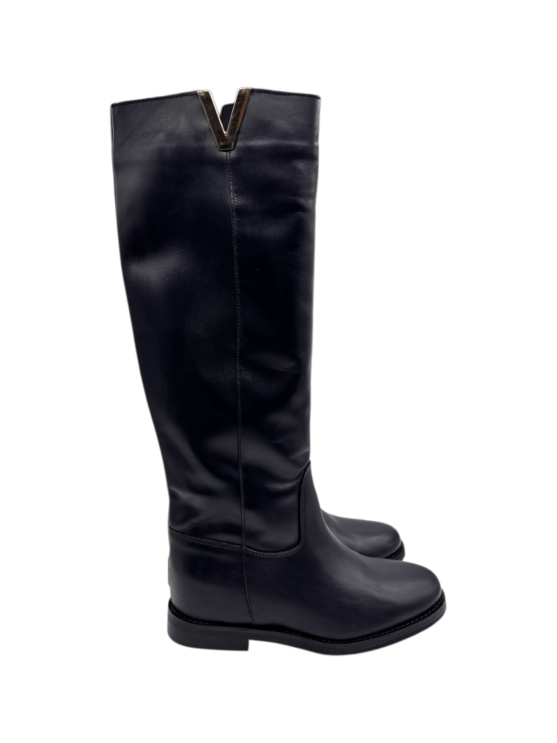 Stivali alti in pelle nera con dettaglio “V” Gold da donna, Made in Italy.