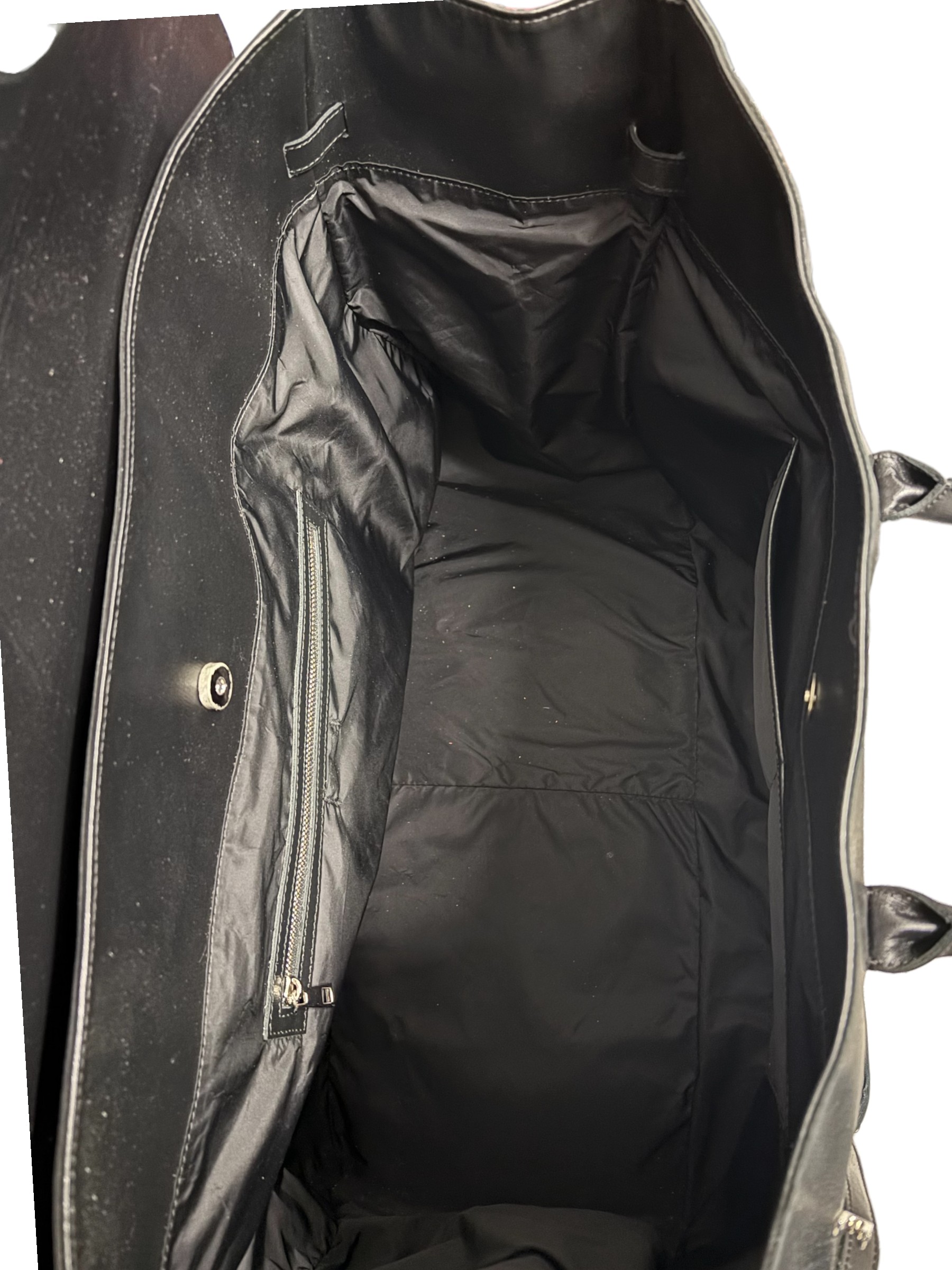 Interni in tessuto nero, borchie inferiori, gancio laterale in pelle.