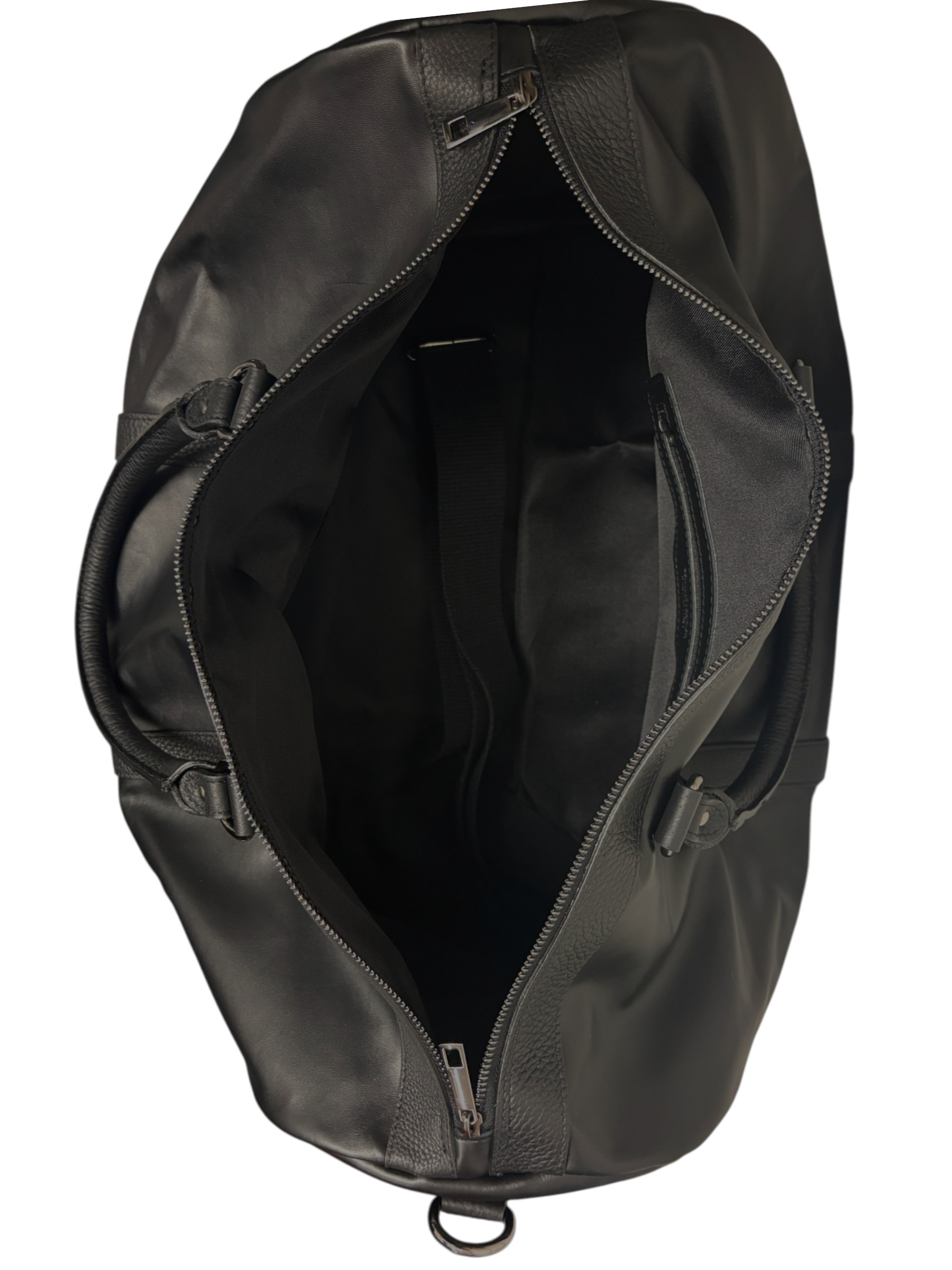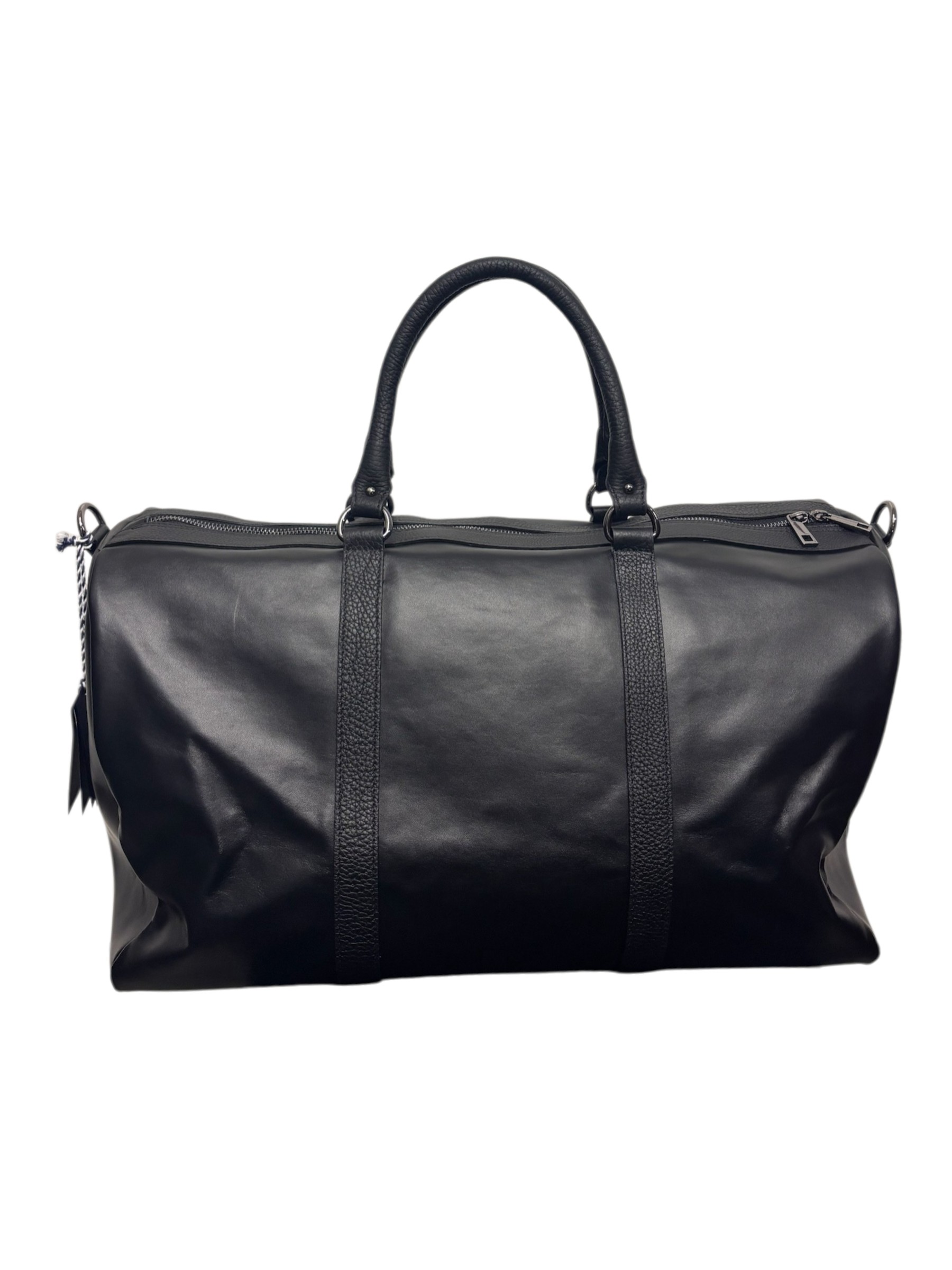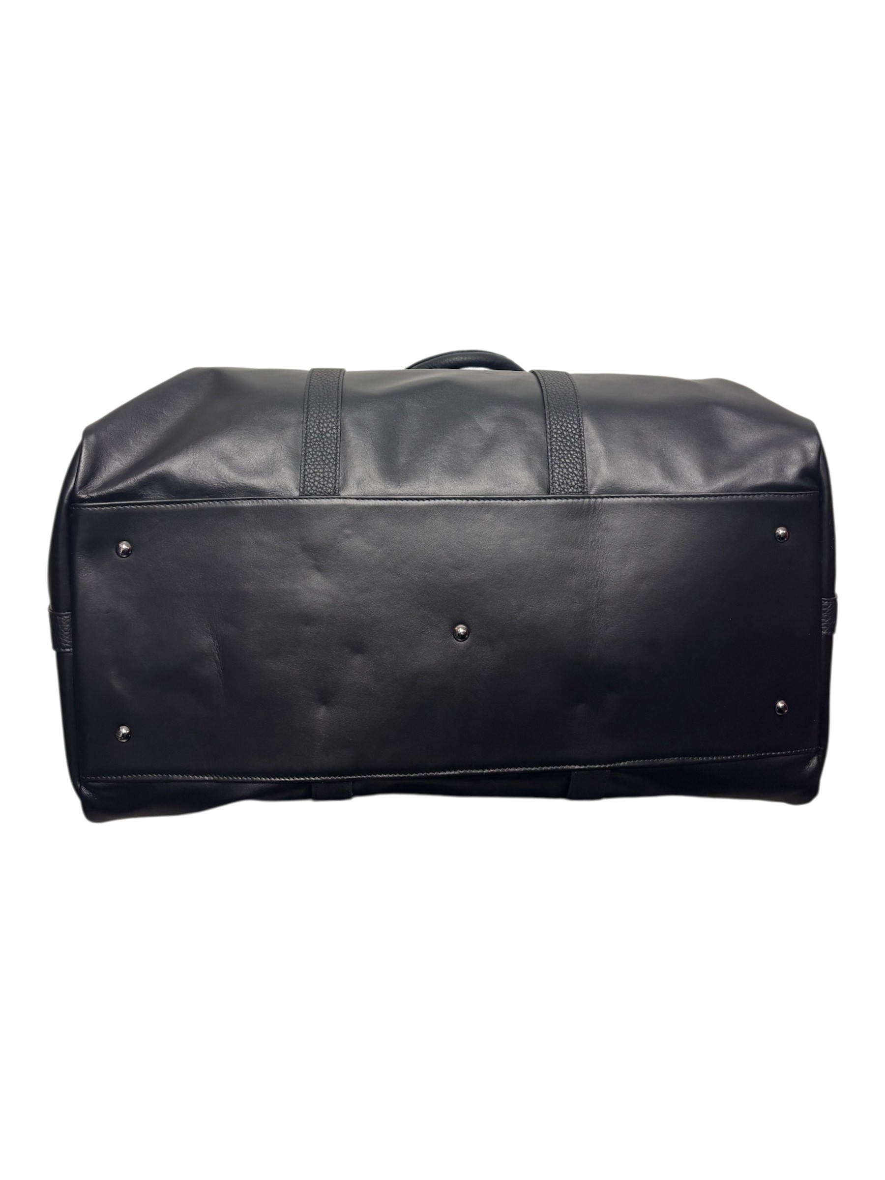 Realizzato in pelle nera di alta qualità. Chiusura a cerniera con doppio cursore. Dotato di doppi manici in pelle e tracolla removibile.