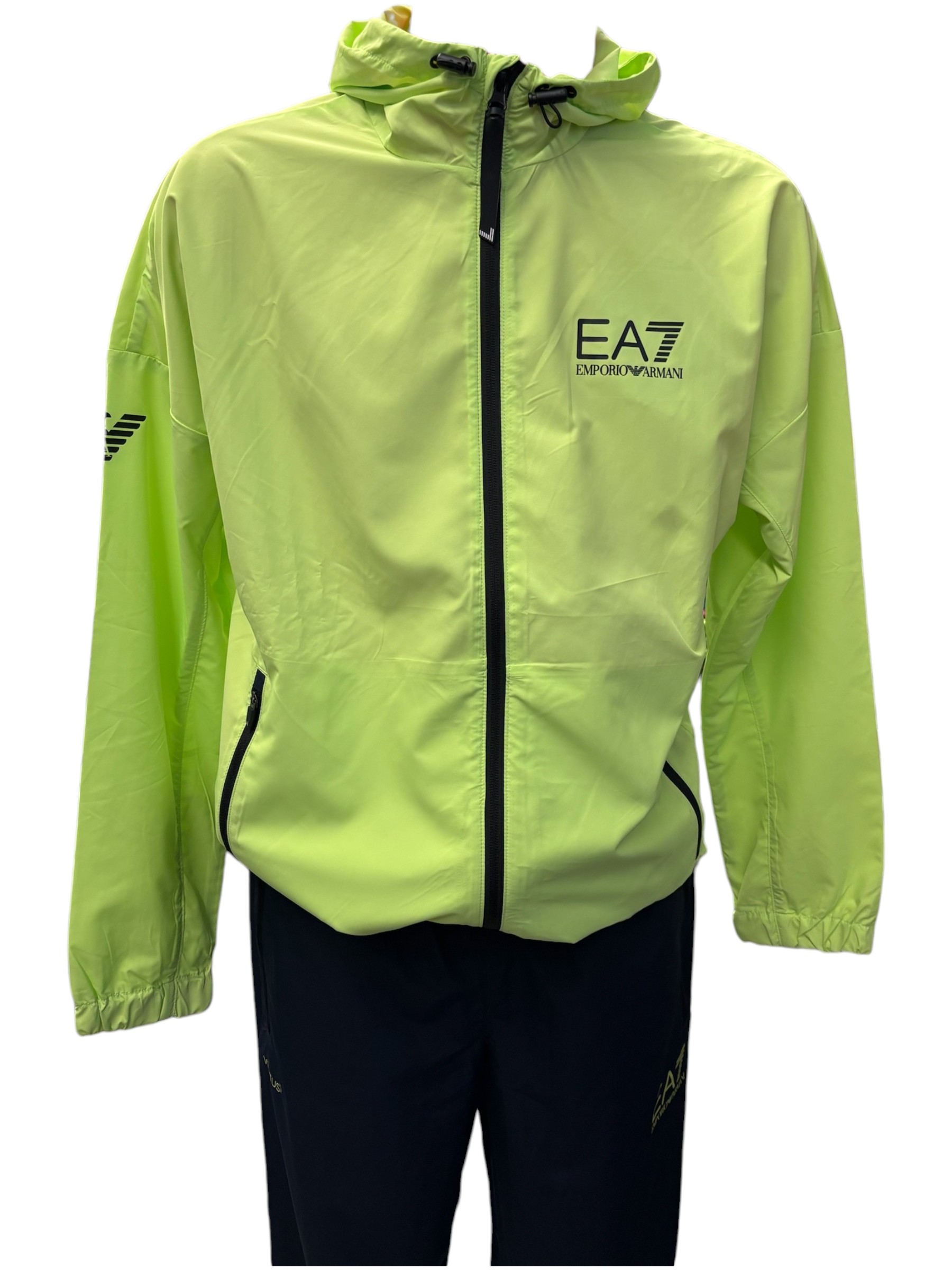 Giacca con cappuccio regolabile tramite coulisse elastica e chiusura a zip intera termosaldata nera a contrasto. Logo EA7 Emporio Armani stampato in nero sul petto a sinistra e logo con l’aquila iconica sulla manica destra. Tasche laterali sempre con chiusura a zip termosaldata.
