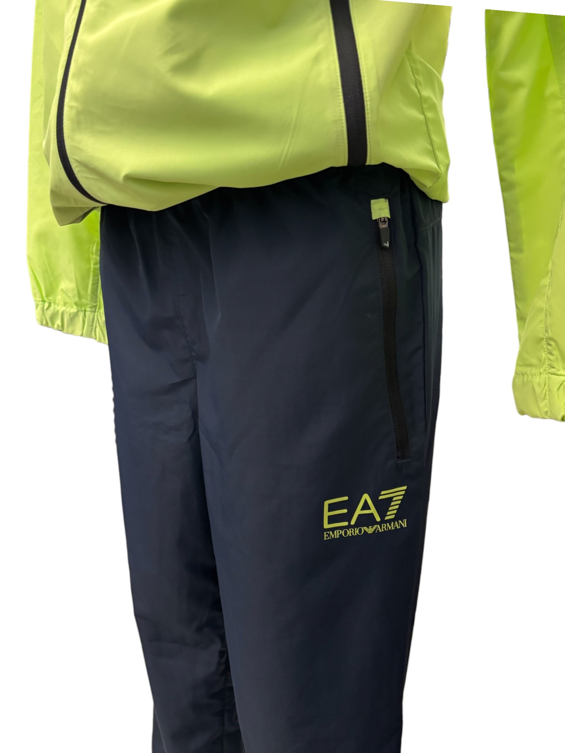 Pantaloni in blu navy con taglio dritto sportivo con vita e fondo gamba elasticizzati. Logo EA7 giallo fluo sulla gamba sinistra e scritta VENTUS7 posizionata sulla gamba opposta. Tasche laterali con chiusura a zip termosaldata.