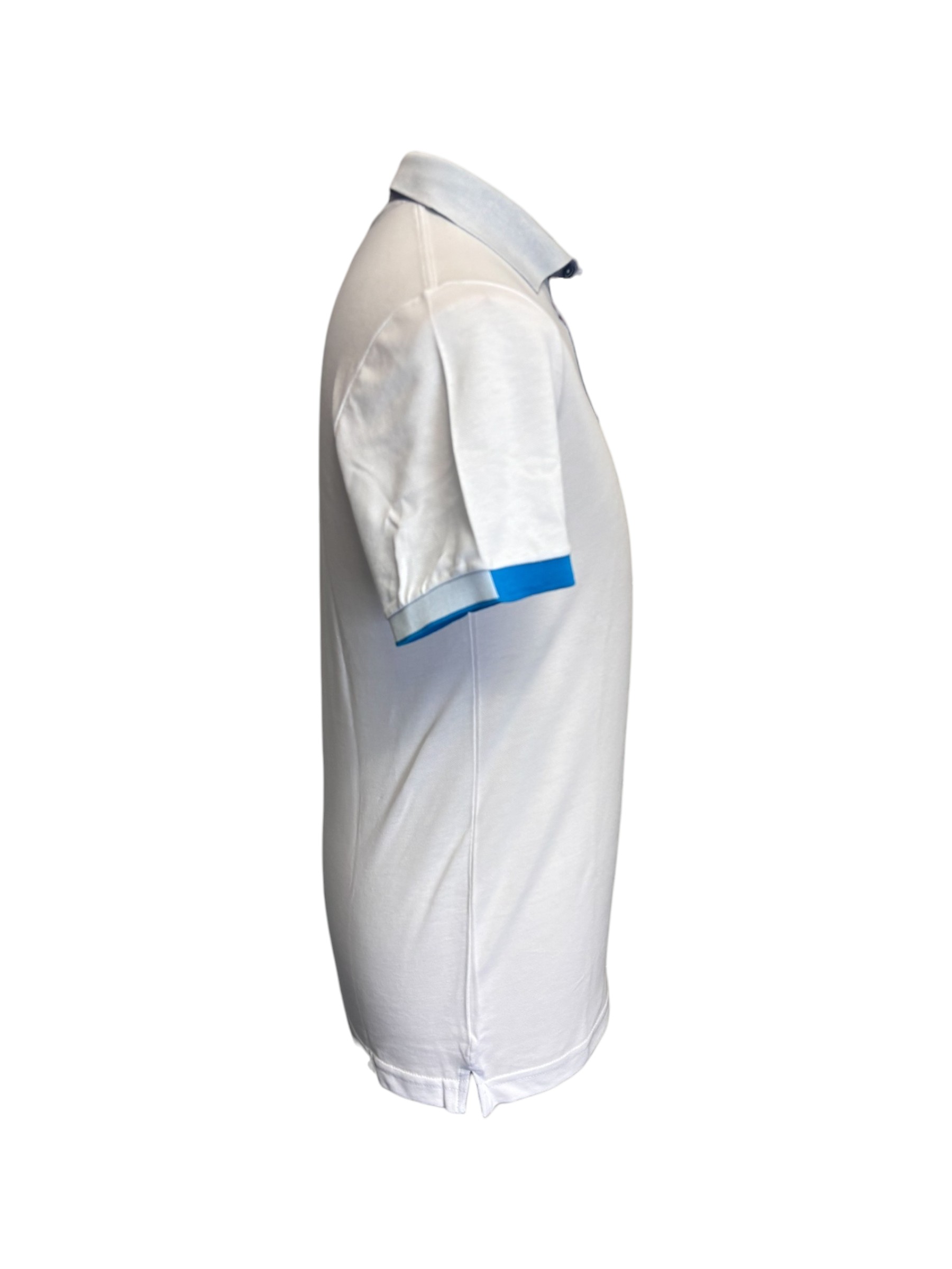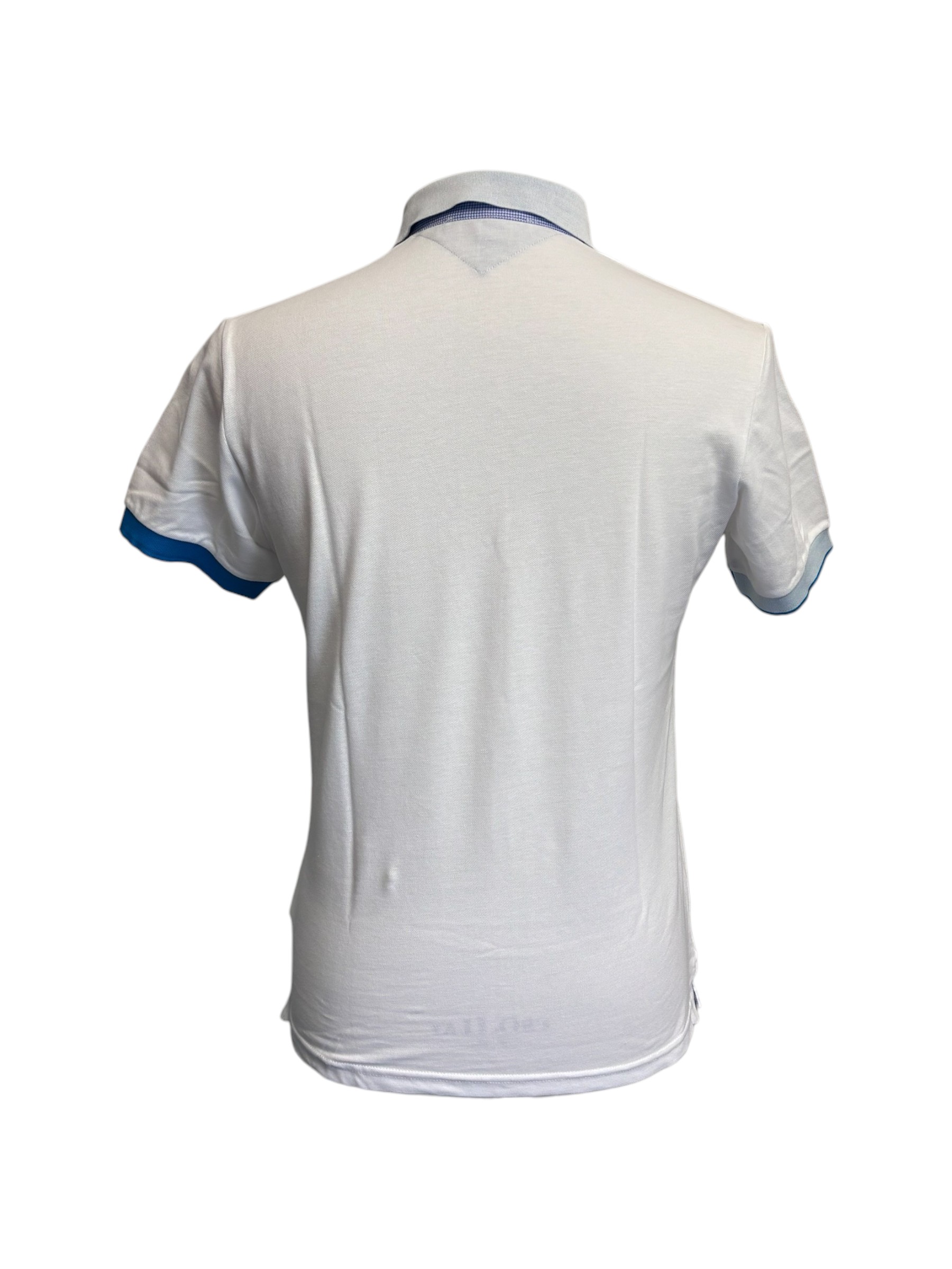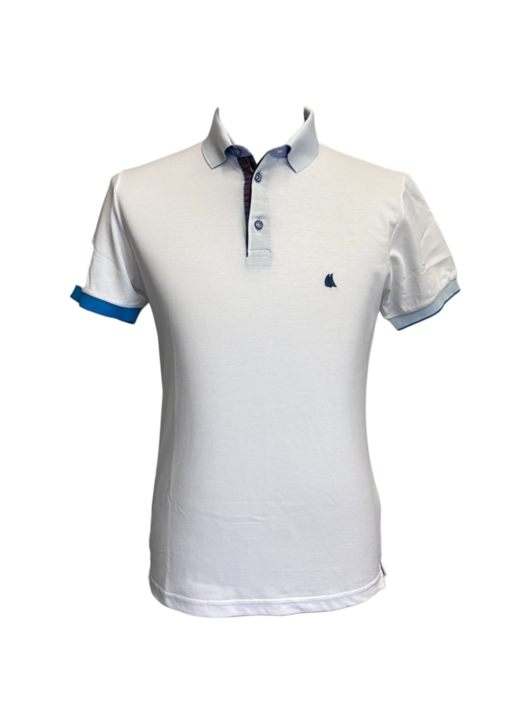 Polo Vela Blu realizzata in pregiato Filo di Scozia, Made in Italy. Chiusura classica a tre bottoni. Colore bianco ottico con eleganti contrasti in diverse tonalità di azzurro e blu. L’abbottonatura interna sorprende con un vivace motivo a quadri multicolore. Logo in filo blu. Regular fit.