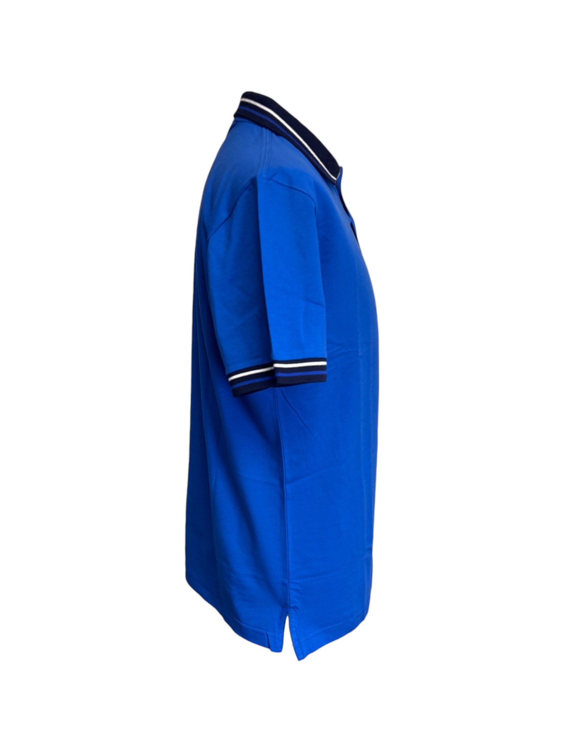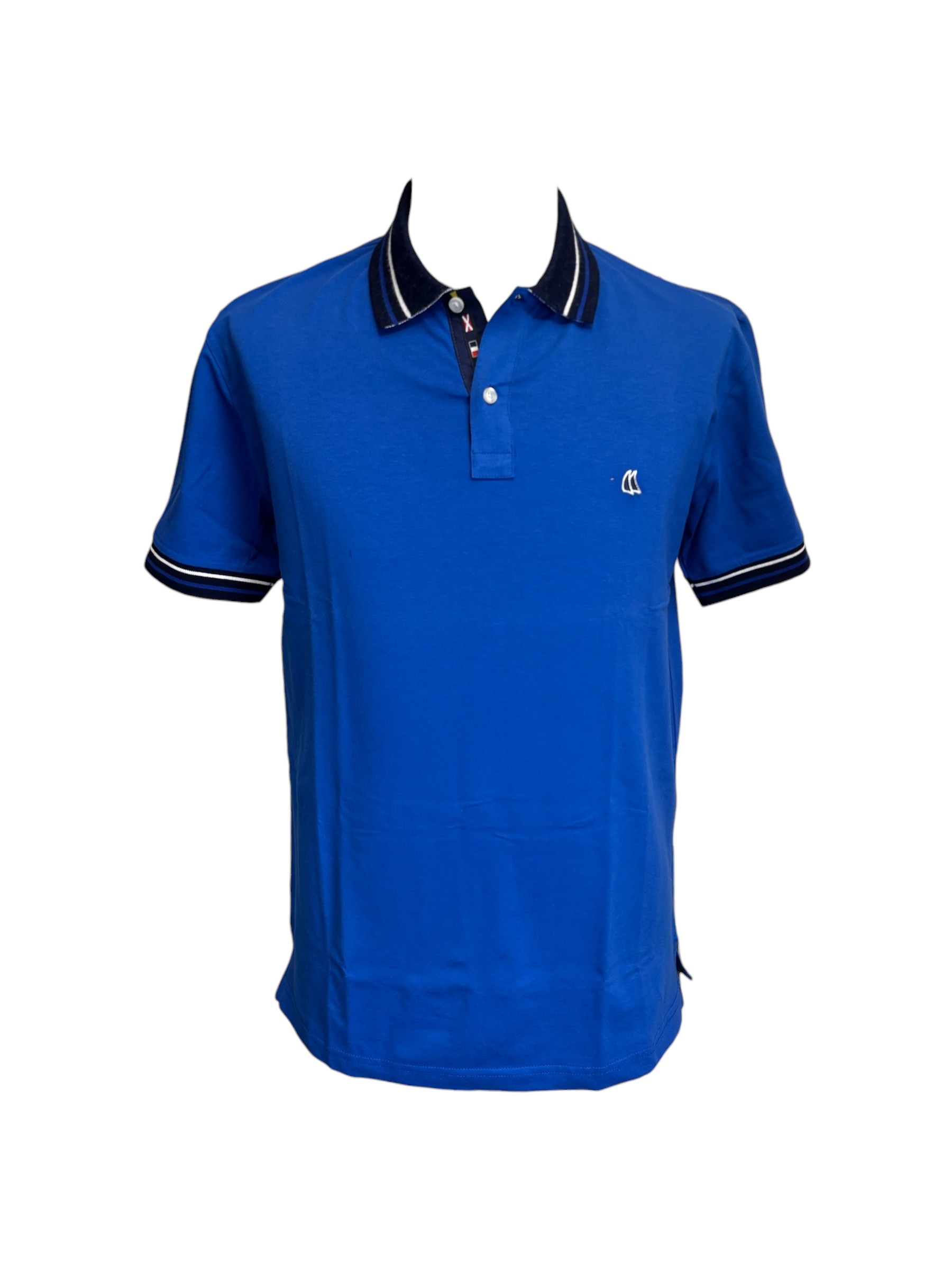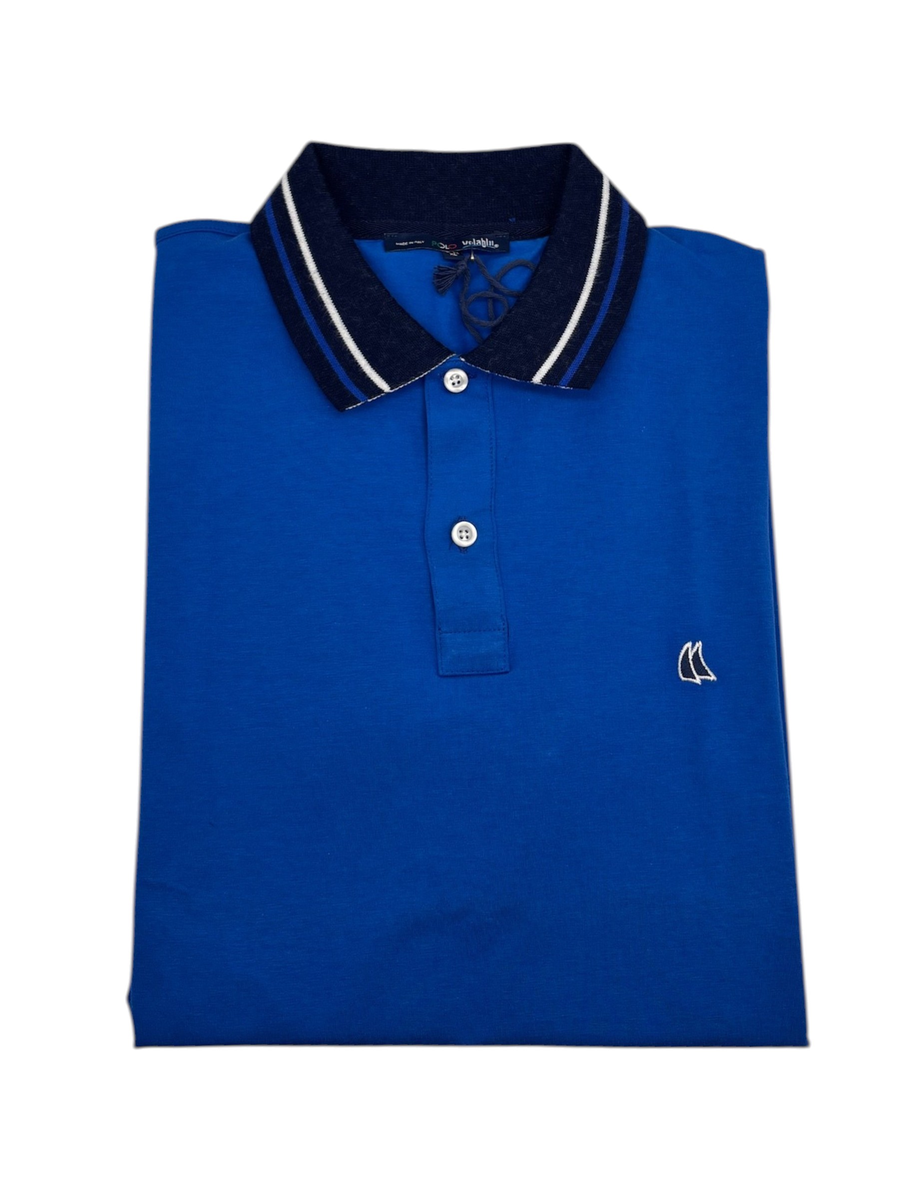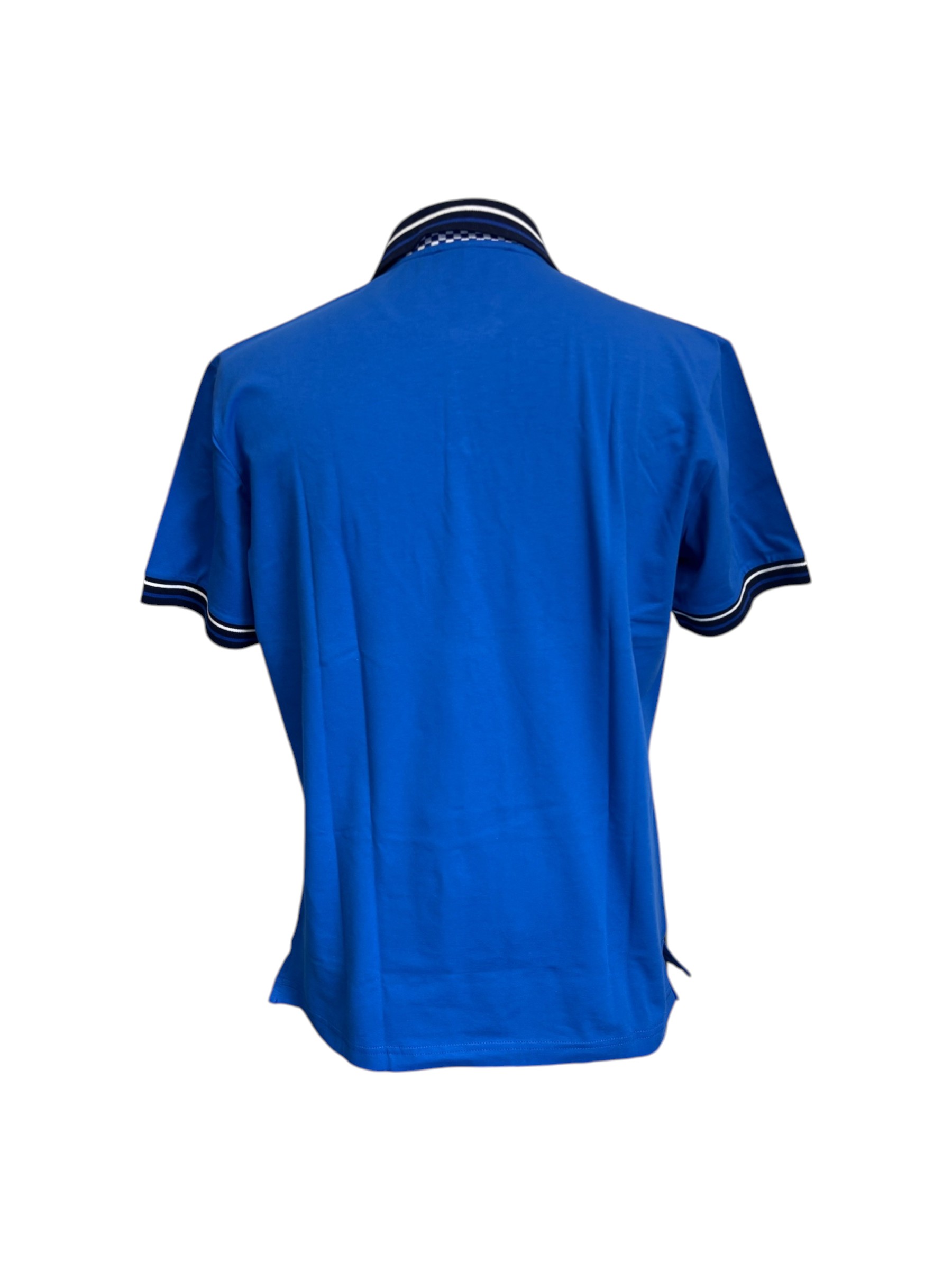 Polo Vela Blu realizzata in pregiato Filo di Scozia, Made in Italy. Chiusura a due bottoni. Colore bluette. Il colletto presenta un raffinato bordo a contrasto blu scuro con doppie piping bianche e bluette e il sottocollo è decorato con una trama a scacchi bianca e blu. Le maniche corte terminano con un bordo elasticizzato che richiama il design del colletto. Logo in filo blu e bianco. Regular fit.