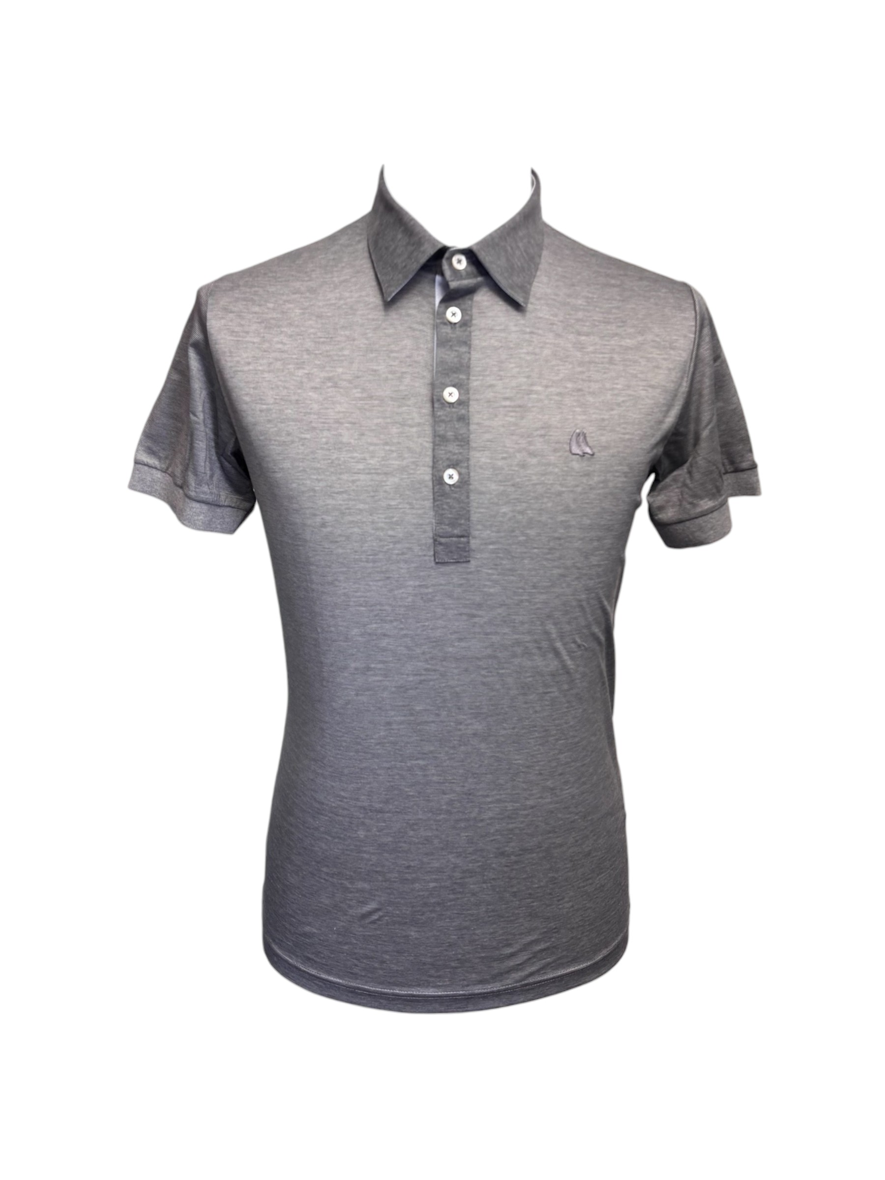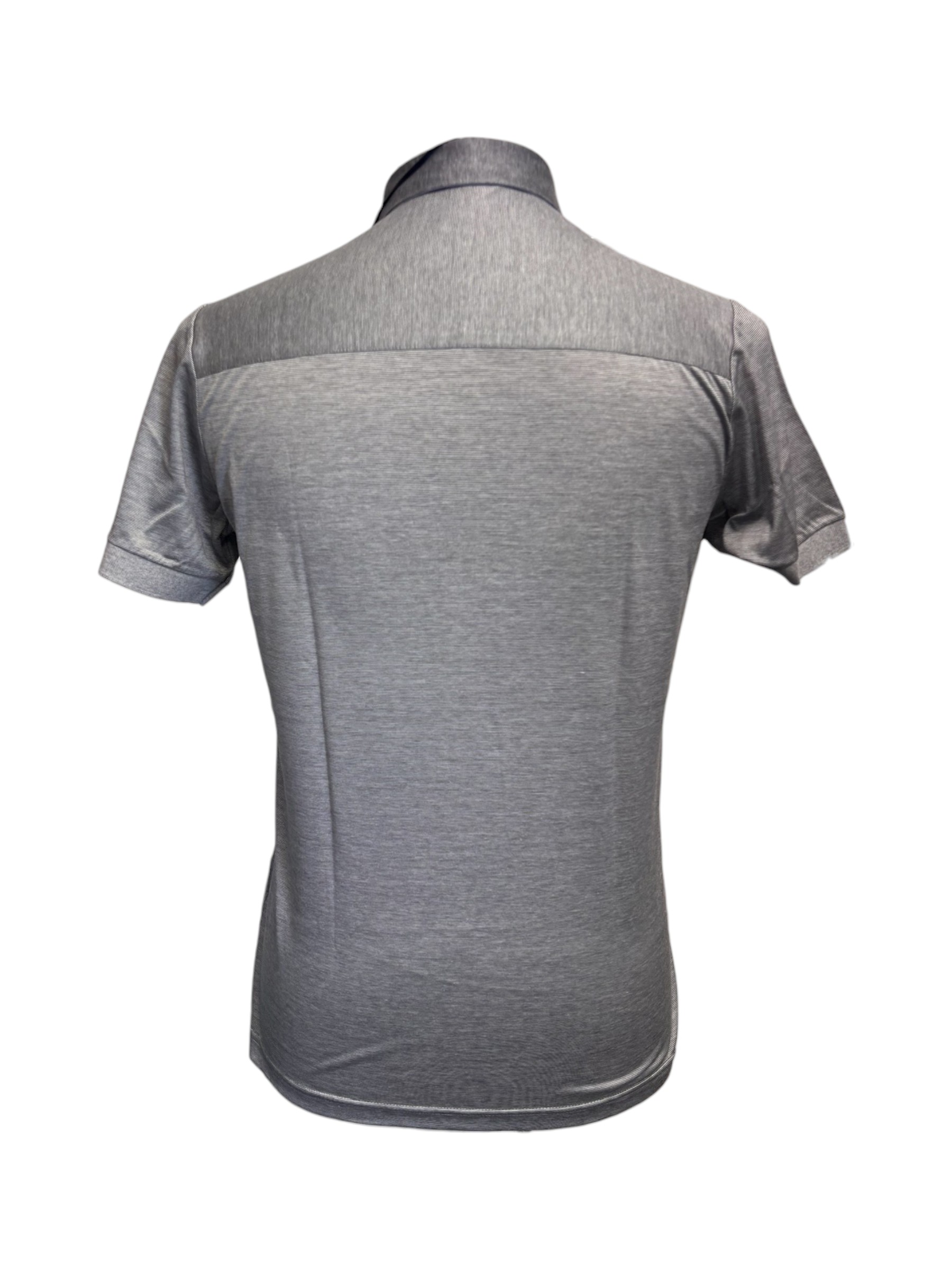 Polo Vela Blu realizzata in pregiato Filo di Scozia, Made in Italy. Chiusura a quattro bottoni. Colore grigio con micro-rigatura orizzontale. Maniche corte con bordo a costine elasticizzato. Il colletto classico è rifinito con un sottocollo a contrasto in micro-fantasia bianca e azzurra. Logo in filo grigio. Regular fit.