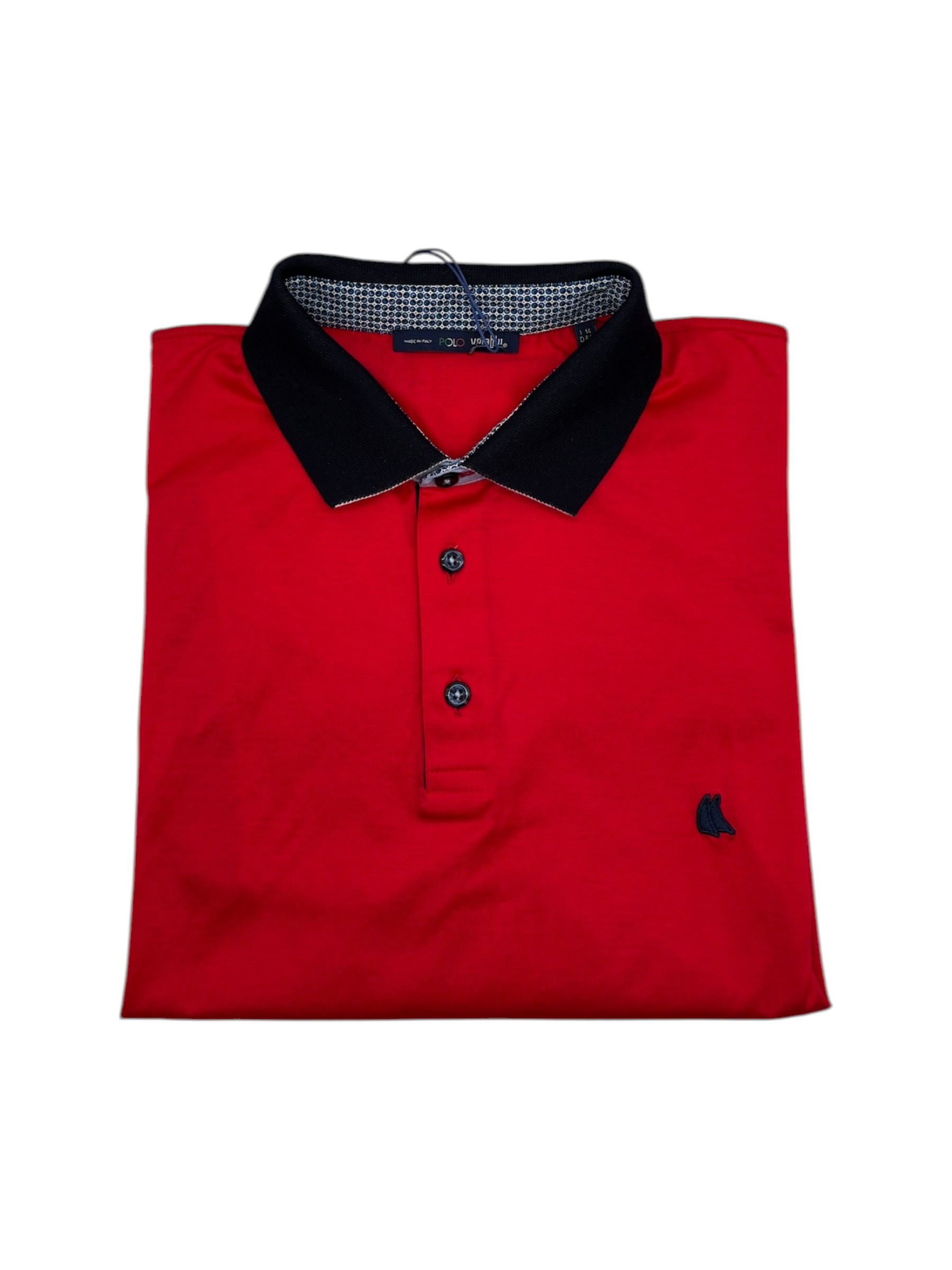 Polo Vela Blu realizzata in pregiato Filo di Scozia, Made in Italy. Chiusura a tre bottoni. Colore rosso. Sottocollo e interno dell’abbottonatura rifiniti con una fantasia geometrica a piccoli pois bianchi su fondo blu. Le maniche corte terminano con un bordo elasticizzato blu navy. Logo in filo blu. Regular fit.